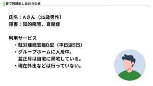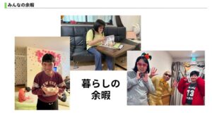 社内で行っているそれぞれの事業所の余暇の紹介+架空の事例を用いてのグループワークを実施しました。