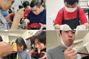 • 8月 そうめん流しを実施しました。そうめんが苦手な利用者さんのためにラーメンやうどんも流し、みんなで笑顔いっぱいの時間になりました。