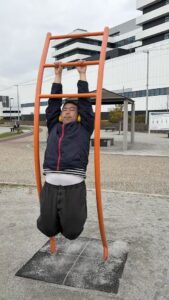 体力づくりの一環として、公園にある運動器具を使った運動にも取り組んでいます。腕や足を動かす器具に挑戦したり、軽いストレッチをしたりと、それぞれの体力に合わせて無理のない範囲で体を動かしています。継続することで「前よりできるようになった」と自信につながる場面も増えてきました。