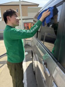 まずは車の清掃です。送迎や外出など、毎日の活動を支えてくれている大切な車を、利用者さま同士で声を掛け合いながら丁寧に拭き上げました。「ここ、まだ少し汚れてるよ」と確認し合いながら、窓や車体の細かい部分までしっかりと磨き、終わった後には「きれいになったね!」と達成感を共有する姿が見られました。